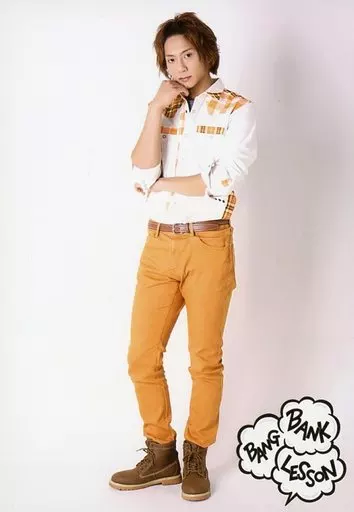 Japanese title: 生写真(男性)/俳優 中尾拳也/全身・衣装白オレンジ茶・右手顎・左手右肘・キャラクターショット/舞台「Bank Bang Lesson!!」ブロマイド
