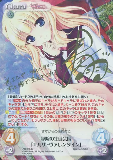 Japanese title: カオス/SP/Chara/風/ブースターパック 千の刃濤、桃花染の皇姫 AU-385[SP]:(ホロ)学院の生徒会長「エルザ・ヴァレンタイン」(奏雨金箔押しサイン入り)