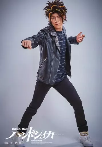 Official photo (male) / actor Yugo Sato (Whole body / Costume Black / Right Hand Rock / Body Right Facing / Legs Spread / Character Actor Shot / Stage 「 Hand Shakers 」 Trading Bromide