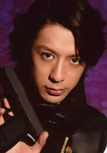 Japanese title: 生写真(男性)/俳優 松本寛也(工藤祐)/顔アップ・右手銃・口閉じ・背景紫・キャラクターショット/舞台「メサイア-紫微ノ章」