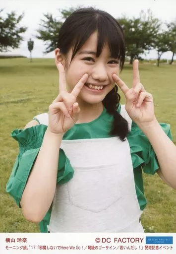 Japanese title: 生写真(ハロプロ)/アイドル/モーニング娘。’17 モーニング娘。’17/横山玲奈/上半身・衣装白緑・右向き・両手ピース・野外/モーニング娘。’17「邪魔しないで Here We Go!/弩級のゴーサイン/若いんだし!」 発売記念イベント オフショットL判生写真