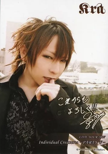 Japanese title: 生写真(男性)/ヴィジュアル系バンド/Kra Kra/景夕/バストアップ・衣装黒・左手親指口・印刷サイン・メッセージ入り/「LIVE TOUR 2007 Individual Creatures ~PARTY F~」デジフォト