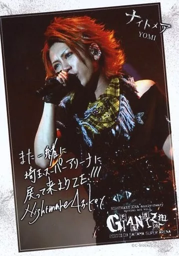Japanese title: 生写真(男性)/ヴィジュアル系バンド/ナイトメア ナイトメア/YOMI/ライブフォト・上半身・衣装黒・右手マイク・左向き・印刷サイン・メッセージ入り/「10th anniversary special act vol.1 GIANIZM~天魔覆滅~」デジフォト
