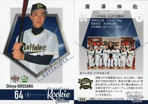 BBM / Regular Card / Orix Buffaloes / BBM2018 RookIe Edition 036 [Regular Card] : Shinya Hirosawa