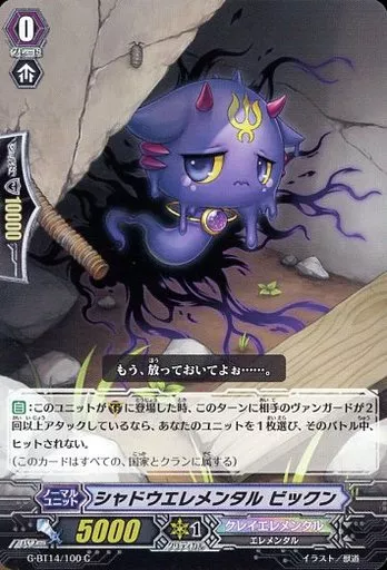 Japanese title: ヴァンガード/C/ノーマルユニット/クレイエレメンタル/ヴァンガードG ブースターパック 第14弾「竜神烈伝」 G-BT14/100[C]:シャドウエレメンタル ビックン