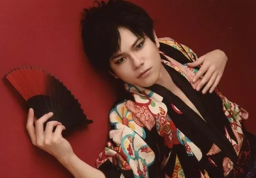 Japanese title: 生写真(男性)/俳優 平野良/横型・バストアップ・寝転び・衣装赤黒・着物・右手扇子・左手胸元・背景赤/舞台「ハンサム落語 第八幕」ブロマイドB