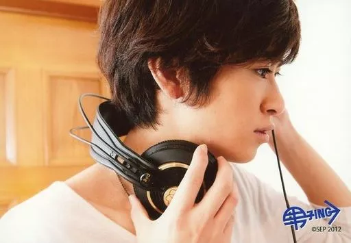 Japanese title: 生写真(男性)/俳優 赤澤燈(ゴロウ)/横型・顔アップ・衣装白・両手ヘッドフォン・右向き・私服ショット/舞台「男子ing!!」生写真