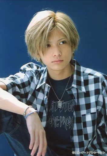 Japanese title: 生写真(男性)/歌手/FLAME FLAME/伊崎右典/上半身・衣装白・黒・座り・右足立て・目線右・背景青/公式生写真