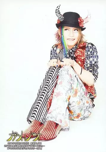 Japanese title: 生写真(男性)/ヴィジュアル系バンド/カメレオ カメレオ/HIKARU./全身・座り・衣装赤白黒・両手膝・帽子・目線左上/赤坂BLITZ 2013年上半期集大成ワンマンライヴショー「アカサカサカスデカメサカサーカス」アーティストフォト