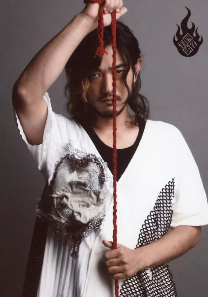 Japanese title: 生写真(男性)/俳優 谷口賢志(大石内蔵助)/上半身・衣装白・両手赤い紐・背景グレー/舞台「四谷怪談」トレーディングブロマイド
