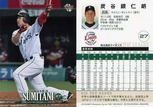 BBM / Regular Card / Saitama Seibu Lions / BBM2018 Baseball Card 1 st Version 038 [regular card] : Ginjiro Sumitani