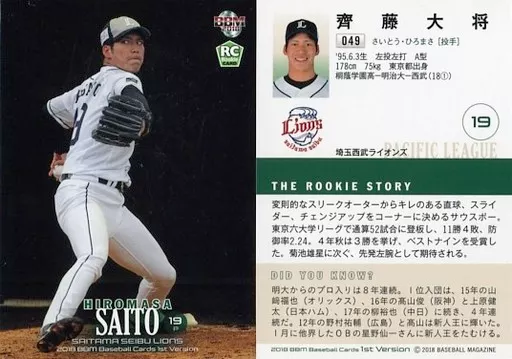 Japanese title: BBM/レギュラーカード/埼玉西武ライオンズ/BBM2018 ベースボールカード 1stバージョン 049 [レギュラーカード] : 齊藤大将