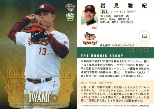 BBM / Regular Card / Tohoku Rakuten Golden Eagles / BBM2018 Baseball Card 1 st Version 076 [Regular Card] : Masaki Iwami (parallel version) (/ 200)
