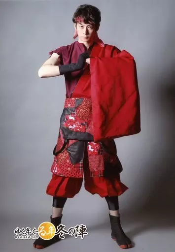 Official photo (male) / actor Ryosei Tanaka / Whole Body / Red Costume / Hand Alignment / Leg Opening / Gray Background / 「 Muku Kuru Fuyu no Jin (wasu Meiji-za Jidaigekisai 」 Bromide