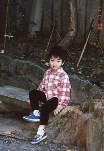 Japanese title: 生写真(男性)/俳優 植田圭輔/全身・衣装赤・白・座り・左向き・野外・幼少期/「超うえフェス2017~田植えにおいで~」トレーディングブロマイド
