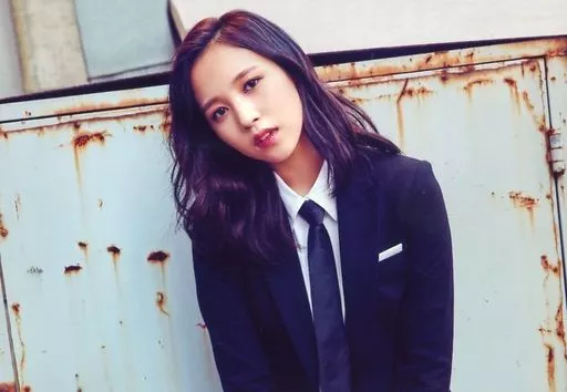 Official photo (Female) / Girl Group / Twice TWICE / Mina / Horizontal / Upper Body / Costume Black / Suit / Both Arms Hanging / Neck Hanging / White Background / "TWICE ONCE BEGINS FANMEETING" Photo Set