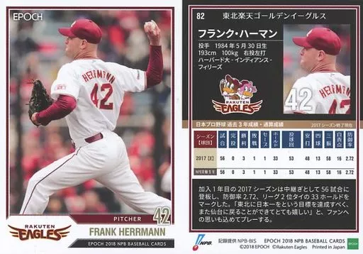 Japanese title: スポーツ/レギュラーカード/東北楽天ゴールデンイーグルス/EPOCH 2018 NPB プロ野球カード 82 [レギュラーカード] : フランク・ハーマン