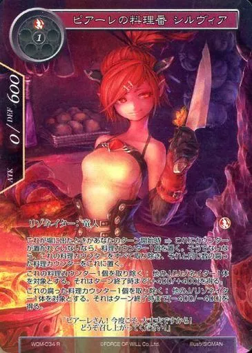 Japanese title: フォース オブ ウィル/R/リゾネイター/炎/零夜クラスタ 第4弾ブースターパック「十六夜の風」 WOM-034[R]:(Foil)ピアーレの料理番 シルヴィア