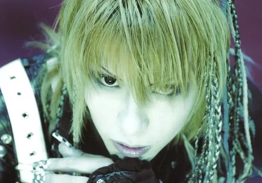 Official photo (male) / visual kei rock band / Vidoll Vidor / Hide / Horizontal, Face Up, Costume in Black, Left Hand Chin, Background in Purple / Photos of goods sales at the live venue
