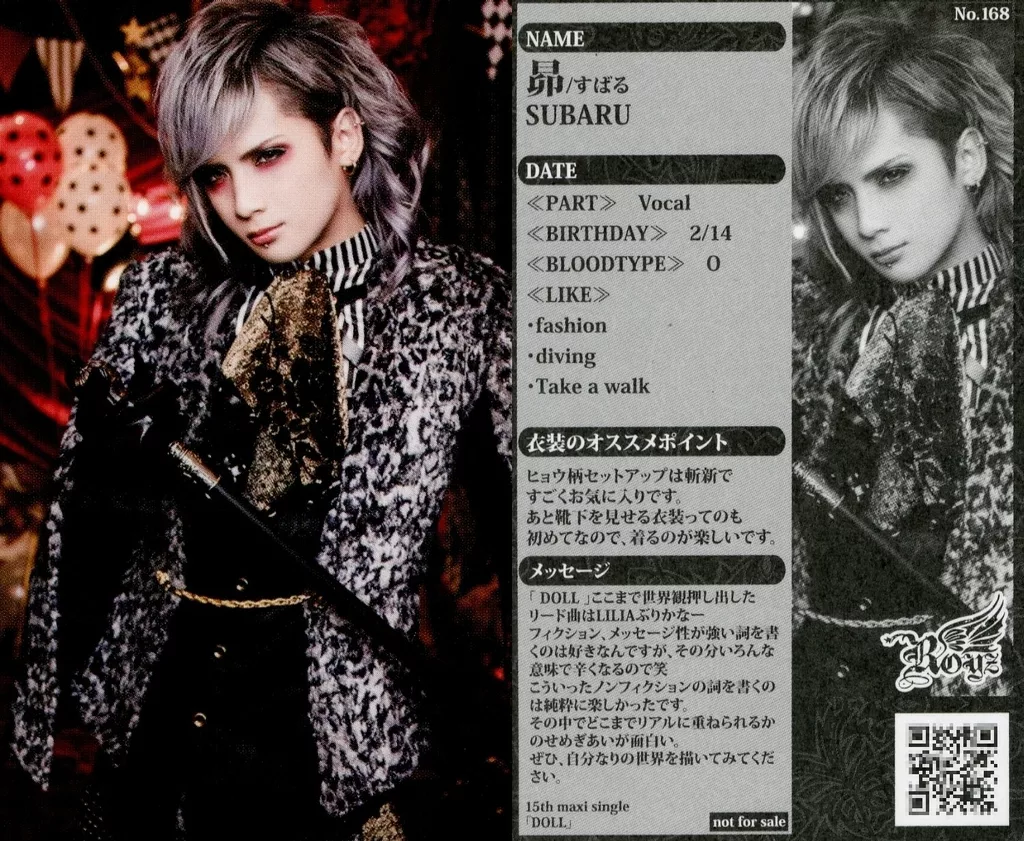 Japanese title: コレクションカード(男性)/CD「DOLL」全タイプ共通封入特典トレカ NO.168:Royz/昴/CD「DOLL」全タイプ共通封入特典トレカ