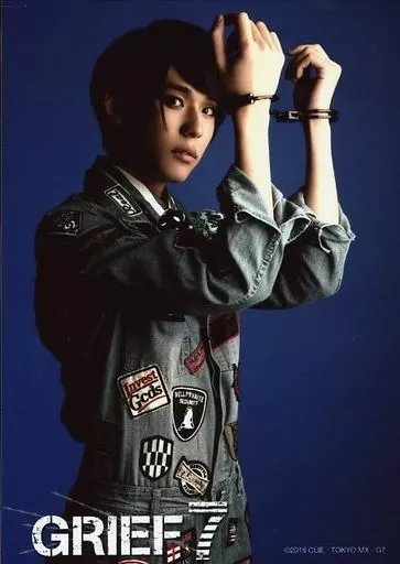 Official photo (male) / actor Kairi Miura (Murase) / Upper Body / Costume Blue / Denim / Tsunagi / Facing right / Lifting both hands / Handcuffs / Background Blue / Musical "GRIEV7" Personal Bromide B