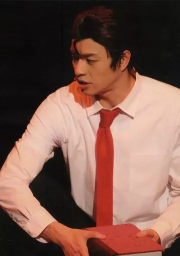 Japanese title: 生写真(男性)/俳優 渡辺コウジ(丸ノ内線)/ライブフォト・衣装白・赤いネクタイ・顔左向き・両手で本持ち/ミュージカル「『青春-AOHARU-鉄道』3~延伸するは我にあり~」ランダムステージブロマイド