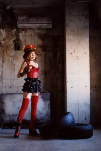 Japanese title: 生写真(女性)/写真家 ろまん/全身・衣装赤・黒・帽子・右手鞭担ぎ・左寄り・ポストカードサイズ/「2人目の消火器」ポストカード写真