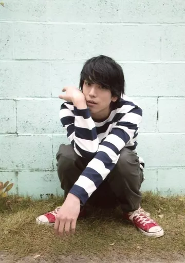 Japanese title: 生写真(男性)/俳優 黒羽麻璃央/全身・衣装ボーダー・しゃがみ・右手頬・顔左向き・背景水色壁/映画「Sea Opening シーオープニング」(東京・福岡会場)完成披露イベント生写真