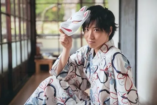 Japanese title: 生写真(男性)/俳優 山本誠大/横型・上半身・座り・衣装白・青・赤・和服・右手お面・左向き・口閉じ・ポストカードサイズ/BSP(ブルーシャトルプロディース)「龍の羅針盤」くじ写真