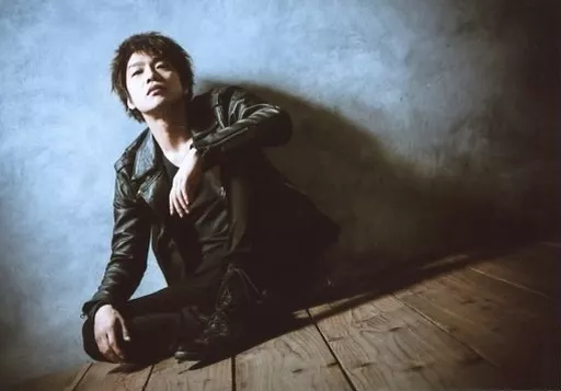 Japanese title: 生写真(男性)/俳優 畑中智行/横型・全身・衣装黒・座り・左膝立て・顔上げ・背景グレー/DVD「ゲームブレイカー」特典ブロマイド
