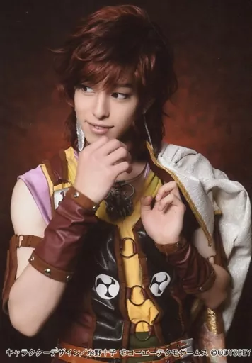 Japanese title: 生写真(男性)/俳優 杉江大志(ヒノエ)/上半身・右手顎・目線左・背景赤黒・キャラクターショット/舞台「遙かなる時空の中で3」ブロマイド ソロセットB