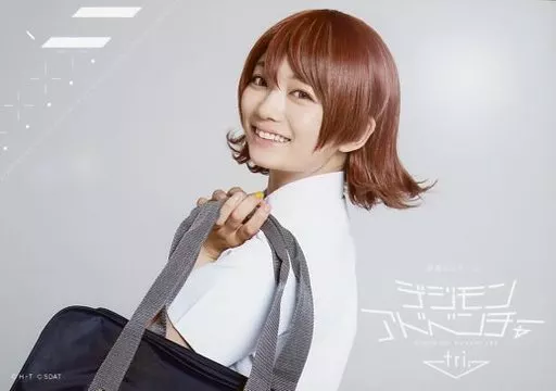 Japanese title: 生写真(女性)/女優 森田涼花(武之内空)/横型・上半身・衣装白・制服・振り向き・両手バッグ・背景白・キャラクターショット/「超進化ステージ『デジモンアドベンチャー tri. ~8月1日の冒険~』」トレーディングブロマイド