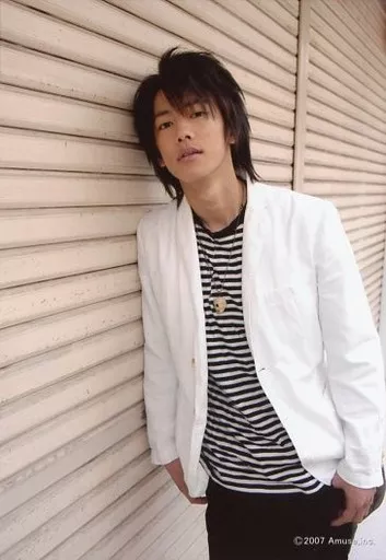 Official photo (male) / actor Takeru Satoh / Kneecap / Dress black and white / Stripe / Left hand pocket / Necklace / Slightly raised face / Postcard size / Official Official photo