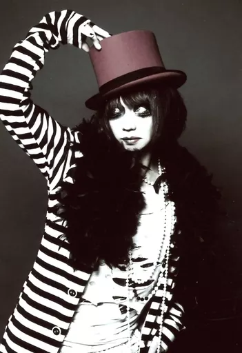 Official photo (male) / visual kei band / Chemical Pictures Chemical Pictures / Yosuke Nishijo / Upper body / Costume black and white / Stripe / Right hand hat / Eye view left / Background grey / Artist Official photo