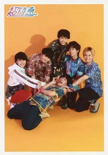 Japanese title: 生写真(男性)/アイドル/超特急 超特急/集合(6人)/全身・しゃがみ・ユースケ寝そべり・口開き・背景黄/「超特急 POP UP STORE」GOLDEN EPOCH SPECIAL 生写真 タクヤ PRUDUCE Ver.(渋谷限定)