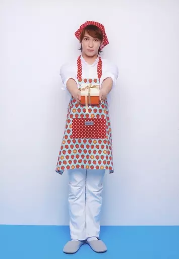 Japanese title: 生写真(男性)/俳優 味方良介/全身・衣装白・赤・エプロン・両手プレゼント/舞台「ママと僕たち よちよちフェスティバル ~もっかい!いち!に!~」観劇特典