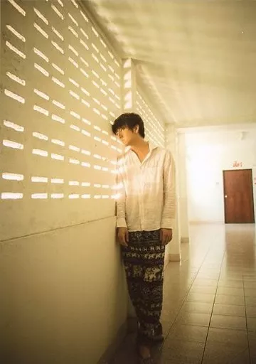 Official photo (male) / actor Yuya Asato / Whole body, Costume white, Dress shirt, Wall leaning, Crossing feet, Indoor / "Yuya Asato 1st DVD 『 TABIATO 』 Release Commemorative Event" Official photo A Set
