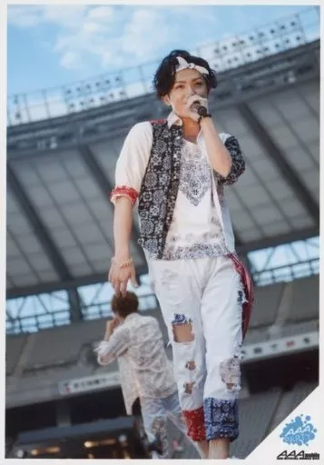 Japanese title: 生写真(男性)/アーティストグループ/AAA AAA/末吉秀太/ライブフォト・全身(足見切れ)・衣装白・黒・赤・左手マイク・背景空/「AAA PARTY/AAA mobile」 a-nation’14 FC限定アーティストフォト