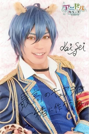 Japanese title: 生写真(男性)/俳優 阿部快征(夏月斗羽)/印刷サイン、メッセージ入り・背景ピンク・キャラクターショット・六つ切りサイズ/ライブステージ 舞台「アニドルカラーズ キュアステージ」 大判ブロマイド アイドル服Ver.