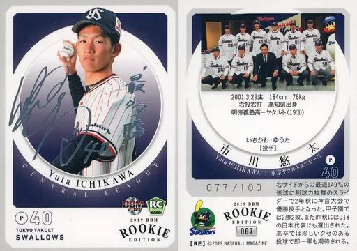 Japanese title: BBM/レギュラーカード/東京ヤクルトスワローズ/BBM2019 ルーキーエディション 067[レギュラーカード]:市川悠太(銀箔押しサイン入り)(/100)
