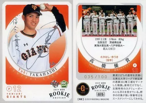 BBM / Regular Card / Yomiuri Giants / BBM2019 Rookie Edition 075 [Regular Card] : Yuki Takahashi (Left Hand Ball / Head) (Silver Leaf Pressed with signature) (/ 100)