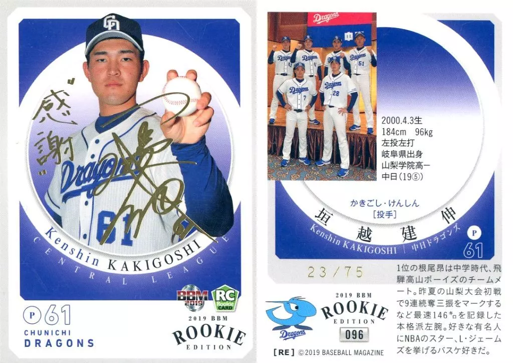 BBM / Regular Card / Chunichi Dragons / BBM2019 RookIe Edition 096 [Regular Card] : 垣越 Kenshin (Gold hot stamping with signature) (/ 75)