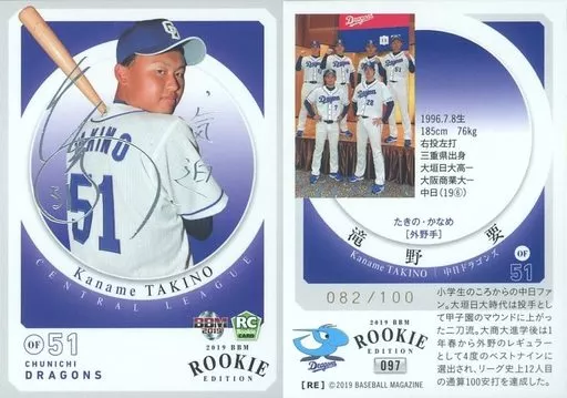 BBM / Regular Card / Chunichi Dragons / BBM2019 RookIe Edition 097 [Regular Card] : Kaname Takino (Silver Leaf Stamping with signature) (/ 100)