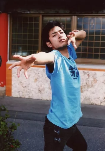 Official photo (male) / actor Naoki Takeshi / Above-the-knee ・ Costume ・ Blue ・ Both Hands Up ・ Body Facing Right ・ Eye Left / "オガステ? 3 ~ U-U-U-U-U-U-U-U-U-U-U-U-U-U-U-U ~ ~" Bromide D