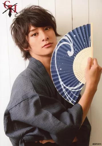 Japanese title: 生写真(男性)/俳優 高崎翔太/上半身・右向き・衣装浴衣・黒・右手扇子・ロゴ入り/撃弾ハンサム 公式生写真