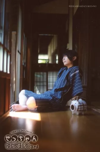 Japanese title: 生写真(男性)/声優 伊藤節生/全身・衣装青・グレー・甚平・座り・あぐら・左向き・両手後ろ/「MOE×PRO其の十八~せっちゃんはじめました3rd~」トレーディングブロマイド