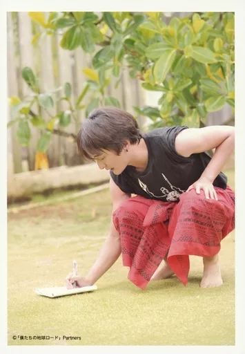 Japanese title: 生写真(男性)/俳優 菊地創/全身・衣装黒・赤・しゃがみ・右向き・右手ペン・屋外/DVD「僕たちの地球ロード In HAWAII フラダンスの真髄を知る」ブロマイド