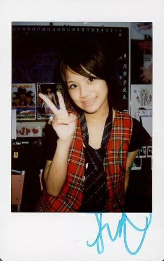 Japanese title: 生写真(女性)/グラビアアイドル ☆有岡ゆい/直筆サイン入り・上半身・衣装黒・赤・チェック柄・右手ピース・首かしげ・後ろに黒板/生チェキ