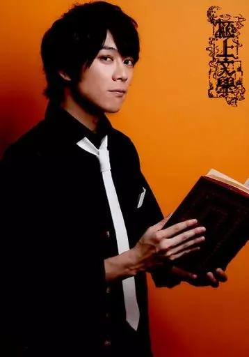 Japanese title: 生写真(男性)/俳優 芹沢尚哉(K)/上半身・衣装黒・両手本・体右向き・背景オレンジ/「極上文學 第13弾 こゝろ」ブロマイドセットA