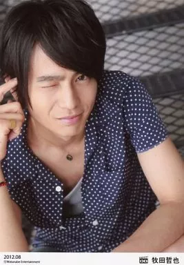 Japanese title: 生写真(男性)/俳優/D-BOYS D-BOYS/牧田哲也/上半身・衣装紺・白の水玉模様・右手人差し指頭・右目閉じ・ウィンク・口閉じ・「2012.08」/公式生写真